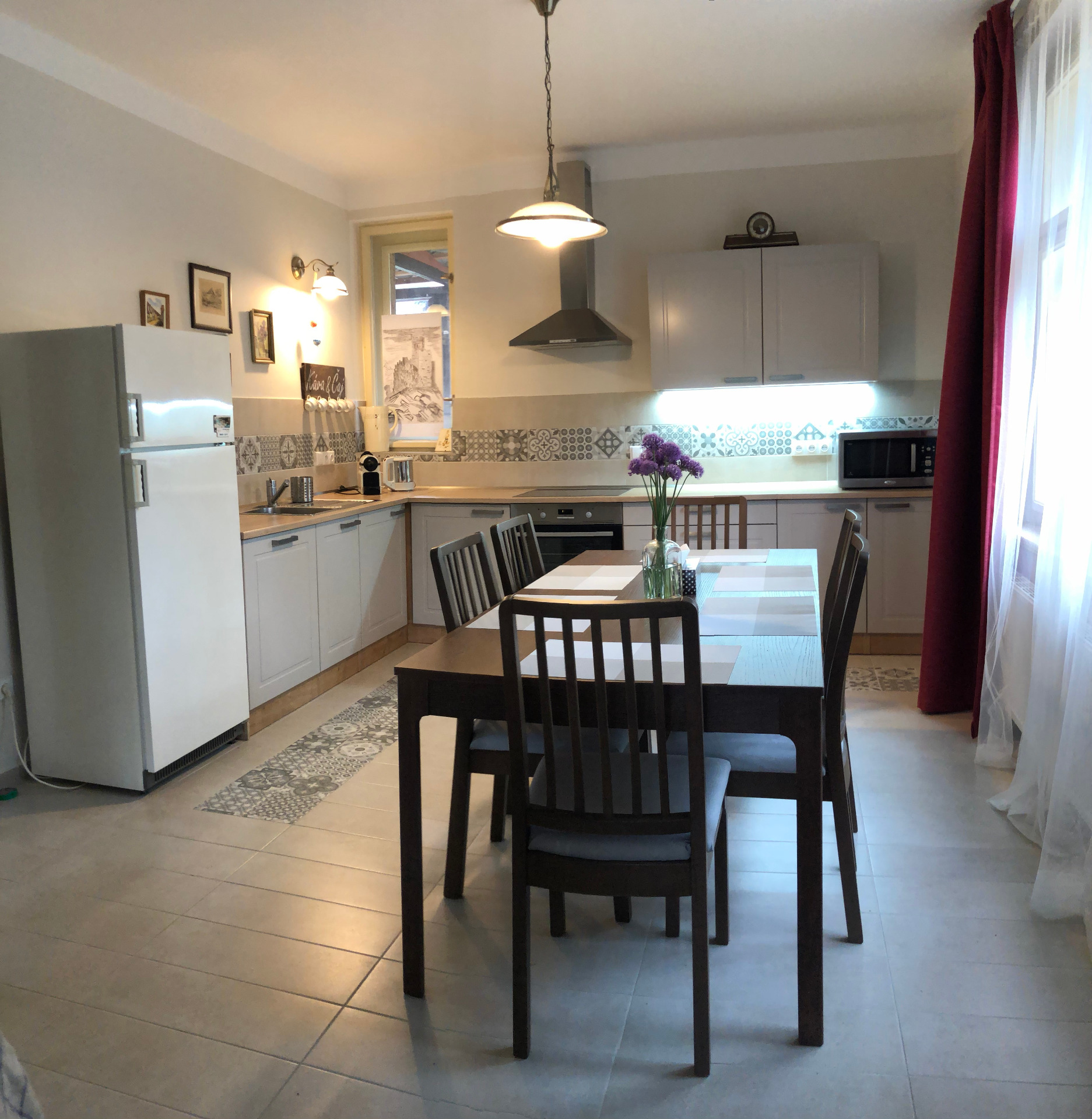 Apartmán má plně vybavenou kuchyni v retro stylu (lednice s mrazákem, kapslový kávovar, myčka, elektrický sporák, rychlovarná konvice, nádobí i utěrky).